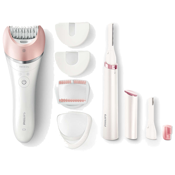 Acessórios: Aparador para corpo e rosto; Pente para sobrancelhas; Acessório para rosto; Acessório para zonas delicadas; Acessório de massagem; Acess. p/ esticar pele; Bolsa; Escova de limpeza